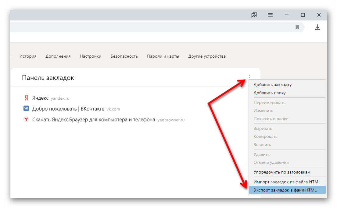 - В окне справа кликаем кнопку в виде трех точек и выпадающем подменю выбираем последний пункт «Экспорт закладок в HTML-файл».