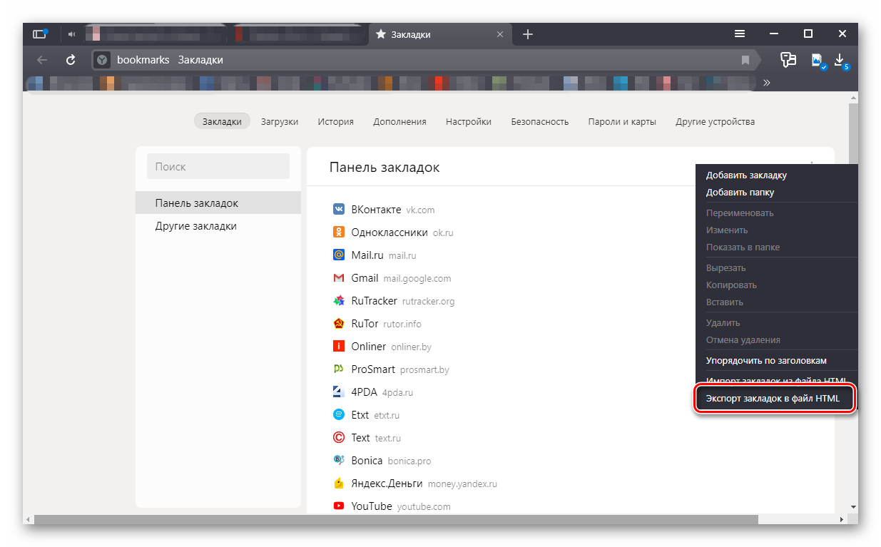 - Появляется меню. Выбираем в нем пункт «Экспорт закладок в файл HTML».