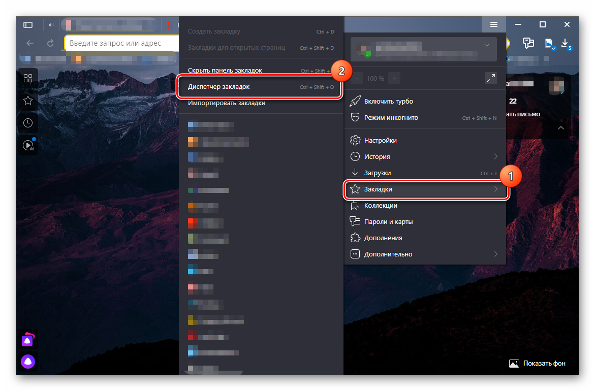 - В появившемся меню выбираем «Закладки». Появится еще одно меню, в котором нужно кликнуть по пункту «Диспетчер закладок».